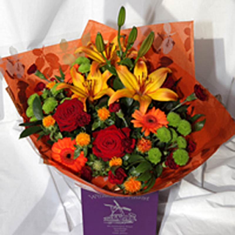 Vibrant shades of red, orange, coral and peach, offset with vibrant green foliage create a heartwarming bouquet, in autumn and all year around. Arranged in water and gift wrapped and presented in a gift box with your choice of personal message.
