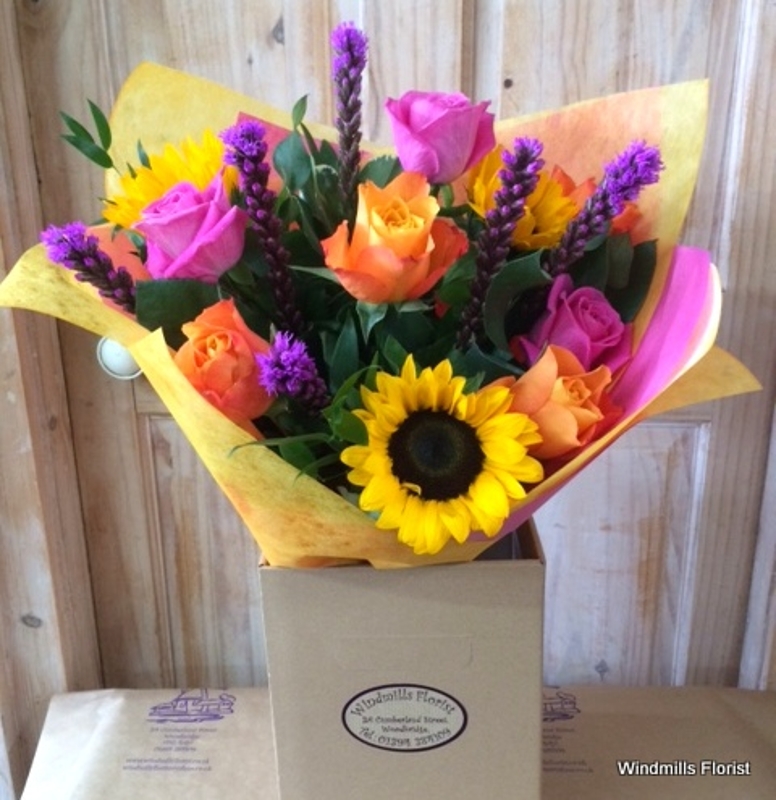 Smiling sunflowers complemented by our seasonal selection of bright blooms. Hand Tied and placed in a water bubble then gift wrapped and boxed. Simply add your personal message to complete this wonderful gift.
