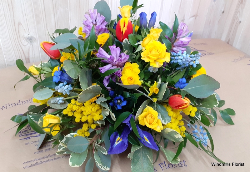 A stunning mix of pretty, fresh blooms, arranged on a round oasis base. A classic tribute that is perfect for placing at the graveside.