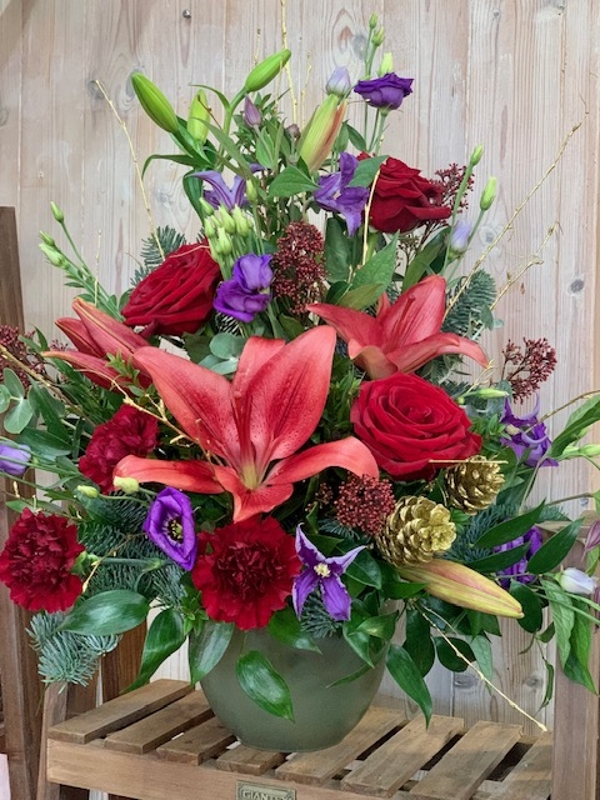 A warm colour palette of rich red, gold and purple blooms with festive adornments, arranged in a ceramic container.