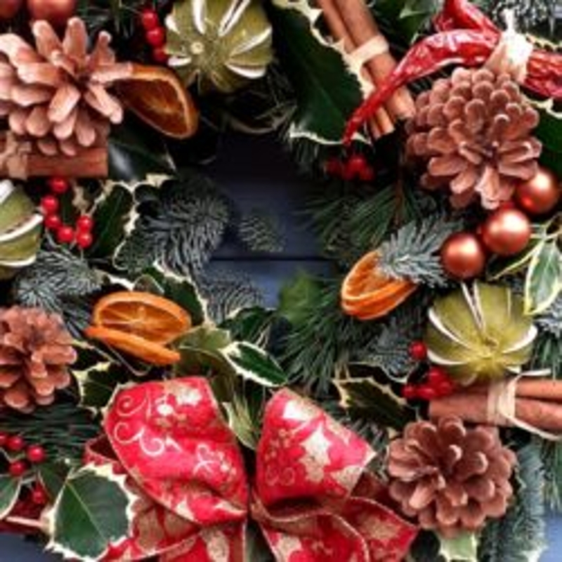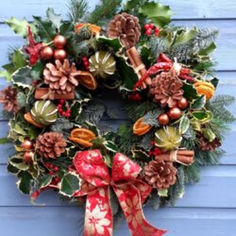 A festive door wreath incorporating an abundance of seasonal foliages, and adorned with Christmas themed decorations. Finished with a complementing ribbon.