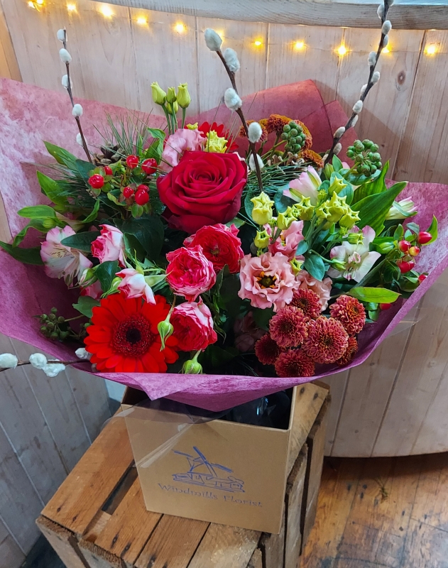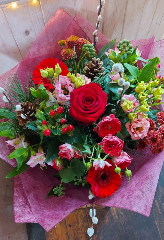 A seasonal selection of ruby reds and raspberry shades gift wrapped in luxury webbed fabric.